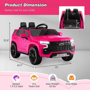 The Electric Kids Ride-On Car with 3 Speeds, All-Terrain Wheels, and Remote Control - Pink is the perfect toy for adventurous young drivers. Crafted from durable PP and sturdy metal, this ride-on car is designed with safety in mind. It is certificated by ASTM and CPSIA, ensuring the highest quality and safety standards. The slow start and stop technology, along with the emergency brake function on the remote control, provide added protection for your child. The openable doors feature a safety lock, and the wide seat comes with a safety belt, ensuring your child's safety at all times. But safety is not the only impressive feature of this remote control ride on car. Its stunning appearance, modeled after the Chevrolet Tahoe SUV, will make your child feel like a real driver. The fantastic headlights, taillights, and lighted dashboard add to the realistic experience. With 2 modes of operation, this ride-on car offers versatility for both parents and children. Parents can use the 2.4G remote control to safely guide their little ones as they learn to drive. The one-key start button, accelerator pedal, and steering wheel provide easy operation and a realistic driving experience. Kids can freely choose between high and low speeds, and move forward or reverse as they please. But the fun doesn't stop there. This ride-on car is equipped with a multifunctional media player that includes dynamic songs, absorbing stories, and FM radio. With an aux input, USB port, TF slot, and advanced wireless connection, children can choose their favorite entertainment audio sources. Powered by 2 powerful 35W motors, this electric car can reach a speed of up to 2.2 mph. The 4 wear-resistant wheels with spring suspensions effectively reduce bumps, allowing the car to drive smoothly on various terrains such as asphalt road, cement road, and brick road. The 12V rechargeable battery provides a longer playtime, ensuring endless hours of fun. Get ready for a joyful journey with the Electric Kids Ride-On Car with 3 Speeds, All-Terrain Wheels, and Remote Control - Pink. Safety, style, and entertainment all come together in this high-performance ride-on car. Key Features: Safety certified by ASTM and CPSIA Slow start and stop technology Emergency brake function on the remote control Openable doors with safety lock Wide seat with safety belt Stunning appearance modeled after Chevrolet Tahoe SUV Fantastic headlights, taillights, and lighted dashboard 2 modes of operation: remote control or manual driving One-key start button, accelerator pedal, and steering wheel High/low speed selection Music player with dynamic songs, stories, and FM radio Aux input, USB port, TF slot, and wireless connection High-performance with 2 powerful 35W motors 4 wear-resistant wheels with spring suspensions Rechargeable 12V battery for longer playtime Product Specifications: Color: Pink Material: PP, Steel Overall Dimension: 26" x 40.9" x 20.8" Net Weight: 34 lbs Weight Capacity: 55 lbs Suitable Age: 3-6 Years Old Speed: 1.9-2.2 mph Battery: 12V/7Ah x 1 Charging Time: 8-12 Hours Battery Type of Remote Control: 2 x 1.5V AAA Batteries