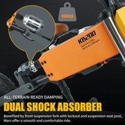 The Electric Off-Road Ride On Bike for Kids - 24V 4Ah Battery Powered Outdoor Toy Introducing the Electric Off-Road Ride On Bike for Kids - 24V 4Ah Battery Powered Outdoor Toy, a revolutionary and thrilling ride-on toy that will take your child's playtime to the next level. With its innovative design and cutting-edge features, this electric bike is sure to provide endless hours of fun and excitement for your little ones. Let's explore the key features and specifications that make this ride-on bike a must-have for every adventurous child. 1. The Ultimate Ride-On Bike for Kids Designed to meet the demand points of the children's electric vehicle market Complete patent product certification and appearance patents in the United States Leader in the market of children's electric vehicles 2. Versatile Speed Modes Two modes: scooter mode when the power is off, and speed monster mode when the power is on Allows children to experience different levels of excitement 3. Super Strong Shock Absorption Performance Front and rear dual shock absorption system Professional damping spring shock absorption for excellent performance Effectively absorbs vibrations and bumps during driving Conquers mud, water, gravel, grass, and other road conditions 4. Safe and Reliable Two startup modes: zero startup and non-zero startup Three gear speed modes: low (6 mph/10 km/h), medium (11 mph/18 km/h), high (15.5 mph/25 km/h) Maximum range of 7.5-9 miles (12-15 km) Ensures the best experience and children's safety 5. Durable and Sturdy Construction Specially designed for children aged 5 to 10 Super large capacity 24V 4Ah battery for strong and long-lasting power 18650 lithium-ion battery with a long lifespan and high safety performance High-power 200W wheel hub motor for smooth and silent starting and acceleration 6. Comfortable Riding Experience Equipped with a comfortable PU seat cushion Adjustable seat for the perfect height according to the child's age and height Two anti-slip handles for a secure grip Fixed pedals to keep children's feet in place while riding 7. Enhanced Safety Features Front disc brake and rear electronic brake for reliable stopping power Dual brakes for handling complex road conditions and continuous downhill Ensures the safety of children during their adventurous rides 8. Intelligent Further App Limit speed, check speed, check battery level, and view total mileage with the app Parents can determine the speed mode and restrict mode changes