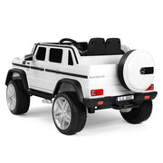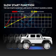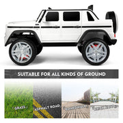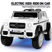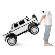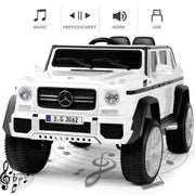Product Description The Electric Ride-On Car for Kids with Music, LED Lights, and Remote Control - 3 Speeds - White Introducing our new and exciting Electric Ride-On Car for Kids with Music, LED Lights, and Remote Control. This officially licensed Mercedes-Benz G650S ride-on car is perfect for children ages over 3 years. It provides a thrilling and enjoyable experience for your little ones as they cruise around in style. Equally enjoyable for parents, the 2.4G remote control allows you to take control and drive your children around. With its comfortable seat and MP3 AUX, your children will have a delightful environment to play in. The 4-wheels with a spring suspension system, seat belt, and double lockable door design ensure a safe and comfortable ride for your kids. This rc ride on car is the ideal gift for both outdoor and indoor playtime adventures. Features: Two Modes of Operation: Kids can operate the electric car themselves using the pedals and steering wheel, enjoying the thrill of driving at 2 different speeds. Parents can also take control using the 2.4GHz remote control, which offers three different speeds. Multiple and Joyful Functions: The built-in AUX port, USB, TF slot, music, and story options, as well as the horn, enhance your child's driving journey, making it even more enjoyable. The high-bright LED lights add a cool factor, especially when driving at night. Safety and Comfort: The slow start function ensures a smooth and gentle acceleration, reducing the impact on children. The door with a safety lock and the enlarged seat with a safety belt guarantee utmost safety and comfort for your child. Durable and Portable Design: Made of non-toxic PP and iron, this electric ride-on car is built to last. The wheels with a spring suspension system are suitable for all kinds of roads, including asphalt, brick, and cement. The luggage handle makes it easy to transport the car outdoors. Perfect Gift: Equipped with a 12V 7AH large-capacity battery with overcharge and overload protection, as well as 2 powerful motors, this ride-on car is designed to provide endless fun. With a size of 46"(L) x 28"(W) x 23"(H) and a weight capacity of 66 lbs, it is suitable for children over 3 years old. The speed ranges from 2 to 4.5 KM/h. The Mercedes-Benz kids car is the perfect present for birthdays and Christmas. Specifications: Color: White Battery: 12V7AH*1 Charger: 12V900MA Car Speed: 2KM/H-4.5KM/H Motor: Two driver motor (12V30W*2RPM10000), Steering motor (12V20W*1RPM6000) Load Capacity: 66LBS Product Size: 46"(L) x 28"(W) x 23"(H) Seat Size: 15"(W) x 7"(D) Backrest Size: 15"(W) x 9.4"(H) Car Bucket Size: 17.3"(L) x 4.3"(W) x 5.3"(D) Applicable Age: 3+ years old Assembly Required: Yes Net Weight: 40LBS Charging Time: 8-12 hours (automatically controlled) Music Function: AUX/USB/TF Cards (USB Flash Drive/Mobile Phone etc.) Remote Controller: Forward, reverse, brake, left, right, speed indicator, speed select Package Content: 1 x Electronic Toy Car 1 x Hardware Bag 1 x Manual Instruction 1 x Bluetooth Remote Control