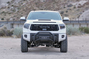 The Toyota Tundra TRD PRO comes with a factory 2" lift compared to other Tundra?s of the same years. Fabtech?s Tundra lift kit provides a 4" lift height on top of the factory 2" lift for clearance of 35" tall tires. Once a Tundra TRD PRO is lifted with a Fabtech 4" lift kit, the truck will sit at the same height as a standard Tundra with a 6" suspension and 35" tires. The near stock track width keeps the tires under the fenders for a clean appearance. Fabtech?s proprietary steering knuckle geometry provides excellent lock to lock turning radius to maneuver in tight spots. Heavy duty 1/4" thick steel crossmembers feature OE style alignment cam pins that utilize the factory cams for easy adjustment. Triple front diff mounts reposition the differential for vibration free operation at high speed. The stainless steel Dirt Logic 2.5 Coilovers replace the TRD PRO Coilovers with an outstanding ride quality both on and offroad. They are designed for aggressive offroad use yet have a supple on road feel. Rear Dirt Logic 2.25 shocks aid in damping the vehicle for a balanced ride. Rear lift is accomplished with a 3? block and u-bolt system. Fabtech has addressed all aspects of the Tundra TRD PRO lift kit for full suspension travel with lock to lock steering without over cycling. Comes with a free 5 year 60,000 mile Powertrain Warranty. FEATURES: CROSSMEMBERS - 1/4" thick steel lower control arm Crossmembers are arched for maximum ground clearance. The welded box design of these Crossmembers provides additional strength to the front suspension. STEERING KNUCKLES - Fabtech?s extended length ductile iron Steering Knuckles provide zero bump steer throughout the suspension travel. This provides an enhanced driver experience compared to stock. Near stock track width keeps the tires under the fenders for a clean appearance. TIE RODS - Oversized tie rods are provided to replace the stock units that are designed to handle oversized tires. DIRT LOGIC 2.5 COILOVERS - Constructe