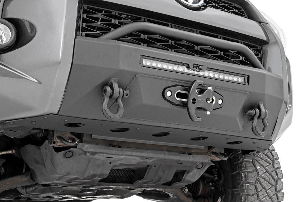 Give the front of your 4Runner an aggressive, new appearance with Rough CountryΓÇÖs Front Hybrid LED Bumper. This easy-to-install upgrade gives your SUV an improved look and better protection, with a 20in LED Light Bar that offers impressive off-road illumination and added winch capabilities your daily driver can become your weekend warrior!\Rough CountryΓÇÖs Hybrid Bumper Kit is modular, letting you pick and choose the options you prefer. Each bumper features trim plates and mounting options that allow you to run a series of LED lights for impressive illumination and can accommodate a recessed winch for off-road recovery. For a more classic look, simply use the provided trim panels for a sleeker appearance.\Take your 4Runner to the next level with this incredible front bumper system. Each bumper is powder-coated flat black and is ready to withstand the elements for a long lifespan of good looks. Best of all each bumper includes a 3-year warranty.