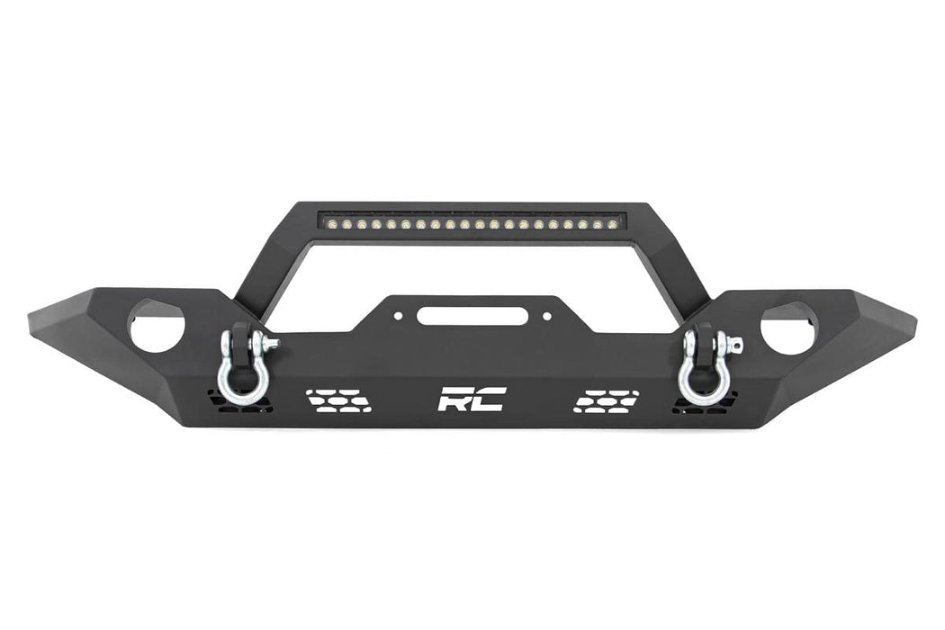 Transform the look and capabilities of your Jeep with Rough CountryΓÇÖs Full Width LED Winch Bumper. This durable, steel bumper features aggressive good looks and packs plenty of features for traversing off-road obstacles. Rough CountryΓÇÖs LED Winch Bumper features a full-width design that fits in nicely with the factory flare or aftermarket modifications. The tapered ends and high-clearance design offer plenty of clearance for optimum approach angles and articulation.This front bumper features a built-in Rough Country 20in Single-Row Black-Series LED Light Bar, providing 7,200 lumens and 100 watts of forward-facing illumination to help you easily see the trail ahead. This bumper is also designed to retain your factory fog lights, with two OE fog light ports that feature an ΓÇ£angry eyesΓÇ¥ look. Each bumper also features multiple recovery options, such as a set of d-ring shackles and a winch mounting plate that can fit any standard-size winch.