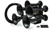 Introducing the Katrina 544K Nightmare Edition Train Horn Kit, designed to deliver an unmatched train horn sound. This kit features a single horn with five chimes, all mounted on a sturdy metal frame, and finished in a stealth black finish that matches the all-black HornAir 544K onboard air system.