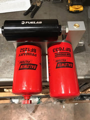 Irate fuel bracket, Fuelab 41401 fuel pump (upgrade to the 41402 for 400+CC injectors), Baldwin filters with billet filter base, -8 line from tank to pump, -8 line from pump to motor, -6 line from motor to tank, 5/8″ pickup tube, Irate regulated return system, all fittings, wiring harness with waterproof conections, relay and circuit breaker. Add a sump for no tank drop install!! This kit comes with our stainless bent hardline fuel bowl delete regulated return kit that eliminates the stock fuel bowl. This system uses a water separator filter to protect the pump from larger debris and water then the final filter to prevent any contaminants getting to your engine!