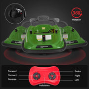 The Interactive 6V Bumper Car for Kids with Remote Control, Flashing Lights, Music, and Customizable Stickers is a thrilling ride-on toy car that offers endless fun and excitement for your little ones. This electric bumper car is designed to provide a unique and interactive experience, allowing children to fully immerse themselves in the world of adventure and play.With its 360-degree rotation capability, this rc ride on bumper car takes the excitement to a whole new level. Your kids can effortlessly maneuver the car in any direction using the simple joystick controls, experiencing the thrill of spinning and twirling around. The maximum speed of 1.24mph ensures a safe and enjoyable ride for children aged 3 to 8 years, with a weight capacity of up to 66 lbs.Safety is a top priority with this bumper car. It features a full surround protective design and a safe belt that helps maintain body balance and stability, ensuring a secure and worry-free ride for your little ones. The soft bumper acts as a cushion, protecting both the car and your child during bumping games. The sturdy plastic shell and anti-flat wheels further enhance the car's durability and safety.To enhance the fun quotient, this bumper car is equipped with built-in music and colorful flashing LED lights. The vibrant LED lights create a mesmerizing visual display, while the music adds a delightful soundtrack to the ride. Your children will be captivated by the combination of lights, music, and the exhilarating ride experience.This bumper car is suitable for both indoor and outdoor use, thanks to its powerful motors that allow it to navigate various surfaces. Whether it's a wooden floor, a tile surface, concrete, or even a thin carpet, your kids can enjoy the ride-on experience anywhere they want.In addition to its thrilling features, this bumper car also offers a personalized touch. It comes with customizable stickers, allowing your toddler or child to decorate their ride according to their preferences. The set includes four sets of 0-9 numbers, giving your child the freedom to create their unique design.Specifications:- Color: Green- Material: PP and Iron- Motor: 25W- Weight Capacity: 66 lbs- Recommended Age: 3 to 8 years- Charge Time: 8-12 hrs (18 for the first time)- Speed: 2km/h- Battery: 6V 4AH- Overall Dimension: 29.9*25.2*17.7 inch- Seat size: 13"W x 8"D- Assembly Required: Yes, Need to Connect The Battery WirePackage Includes:- Ride-on Bumper Car x 1- Remote Controller x 1- User Manual x 1- Charger x 1- Number Stickers x 1Get ready to embark on a thrilling ride with the Interactive 6V Bumper Car for Kids with Remote Control, Flashing Lights, Music, and Customizable Stickers. Let your children's imagination run wild as they enjoy the ultimate ride-on experience filled with adventure and joy.