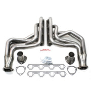 JBA long tube headers are the number one choice for maximum performance gains and high RPM efficiency. Available in 409 or 304 Series Stainless Steel. These long tube designs are dyno and race proven to deliver the greatest possible increase in horsepower and torque throughout the RPM range. All JBA long tube headers feature large mandrel-bent stainless steel primary tubes, oversized exhaust ports, extra thick 3/8 one-piece flanges, and proprietary JBA FireconeĀ® merged collectors for smooth flow. Each system is designed to give the maximum amount of ground clearance possible, so lowered cars do not drag the collectors.