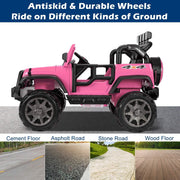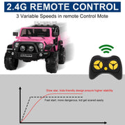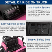 The JOYMOR 12V 2-Seater Ride On Truck for Kids with Remote Control, MP3 Player, LED Lights, and Horn Get ready for an adventure like no other with the JOYMOR 12V 2-Seater Ride On Truck for Kids. This realistic and stylish ride-on truck is designed to bring fun and happiness to children in a safe environment. With its cool appearance and realistic design, it's sure to create special memories for your children in their childhoods. Whether your little ones want to take the wheel themselves or you want to take control with the remote, this remote control ride on truck is perfect for hours of endless fun. Key Features: Realistic design and cool appearance Equipped with music and MP3 player for added entertainment Easy to operate by kids Parents can also control the car with the remote control when necessary Specifications: Color: Pink/ Black / Red Battery Type: 12V 7Ah Charge Time: 8-12 Hrs Run Time: 1 hour (Depend on Kids Weight And Speed) Maximum Speed: 4 mph Maximum User Weight: 110 Lb / 49.9kg Remote Control: 2*AAA battery (Not Included) Music Function: AUX/ USB / TF Cards (USB Flash Drive/ Mobile Phone etc.) Overall Dimensions: (49.21 x 31.50 x 31.50)" / (124.99 x 80.01 x 80.1)cm(L x W x H) Features: Two Mode Control: Parent can operate the toy truck with 2.4G remote control to ensure safety with 3 adjustable speeds, parking, forward and reverse modes functionally. Moreover, kids can drive manually with 2 speeds and stop on the release of the foot pedal. This allows them to easily drive the car and exercise their hand and foot coordination. Designed for 2 Kids: The overall dimensions of this ride-on truck are 49.21"(L) * 31.5"(W) * 31.5"(H). It is designed to comfortably accommodate two kids. The seat width is 18.9" and the seat depth is 7.5". With a maximum weight capacity of 110 LBS, it is suitable for two kids aged 3 years old or one kid aged 4-8 years old. Multimedia for More Fun: This ride-on truck is equipped with music, a USB port, AUX input, TF card slot, story, early education, and more. Your loved one will have a blast riding on this car while enjoying their favorite tunes or listening to stories. Powerful Battery: The battery is rechargeable and can last for one to two hours of run-time after a full charge. It is recommended to charge the battery for 24 hours before its first use and continue to charge it for up to 8 hours when needed. Worthy Gift for Kids: Carefully crafted with safe materials and certified by ASTM F963, this electric ride-on truck is a perfect gift to accompany your kids. It is perfect for both indoor and outdoor play, providing endless fun and excitement.