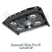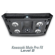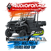 Introducing the AudioFormz roof top stereo system, designed exclusively for the Kawasaki Mule PRO-FX, one of Kawasaki's most versatile and hardworking SxS's. This stereo top sets new standards in versatility and sound volume. Constructed from solid hand-laid molded fiberglass, it's among the lightest yet strongest in its class, enhancing your Mule PRO-FX without compromise.