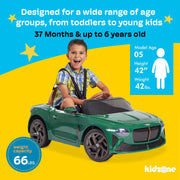 The Kidzone 12V Kids Ride-On Car with Remote Control - Available in 5 Vibrant Colors! is the perfect toy to entertain and educate your children while teaching them how to be safe road adventurers! This Licensed Bentley Bacalar Ride On will make their dreams of driving come true with its realistic appearance, various functions, and safety wheel design. Let your little ones create unforgettable childhood memories with this fun and exciting ride-on car.Full Enjoyment:- Experience a real driving adventure with the Kidzone 12V Kids Ride-On Car. It features a realistic car appearance design, complete with openable doors, an electric foot pedal, forward/backward gear, a steering wheel, and bright LED front lights. Your child will feel like a true driver!- This rc ride on car offers two modes of operation. The parental 2.4G wireless remote control allows parents to take control and ensure their child's safety. The manual operation mode is perfect for older children to experience the thrill of driving on their own. With 3 speeds in R/C mode and 2 speeds in manual mode, there's a suitable speed for every adventure.Various Functions:- The Kidzone 12V Kids Ride-On Car is equipped with bluetooth wireless technology, allowing you to connect your device and play your child's favorite music, stories, lessons, and more. The FM Radio and AUX port provide even more entertainment options, making every ride a fun-filled experience.Spring Suspension System:- Every wheel of this ride-on car is equipped with a spring suspension system, ensuring a smooth and comfortable ride. Your child can enjoy playing with this car on any terrain, making it the ideal toy for outdoor adventures.Product Specifications:- Available Colors: Black, Green, Red, White, Yellow- Brand: Onebigoutlet- Material: Plastic- Type: Children's Powered Ride-Ons- Upc: Does not apply- Battery: 12V 4.5 Ah- Charger output: 12V 500 mA- Battery Charge Time: 8 - 12 hours- Speed: 1.86 - 3.11 mph (3 - 5 km/h)- Suitable Age: 37-96 months- Maximum User Weight: 66 lb / 30 kgPackage Includes:- 1x Kidzone 12V Kids Ride-On Car- 1x Charger- 1x Remote Control- 1x Instruction ManualLet your child's imagination run wild with the Kidzone 12V Kids Ride-On Car with Remote Control. Order now and give them the ultimate ride-on car experience!