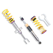 Cutting-edge motorsports technology for more performance on the road. Like every suspension product developed by KW automotive, the suspension manufacturer, and manufactured in Germany, the KW V3 Coilover suspension kit also provides a significant plus in safety reserves in road traffic. Thanks to the chassis with its high-quality dampers, springs, and elastomer spring elements, pitching and rolling movements during load changes such as evasive maneuvers, cornering, acceleration, and braking are significantly reduced. The braking distances are also shortened. Thanks to improved support and feedback, drivers not only feel safer but driving in everyday life becomes even safer. With compression and rebound stage damping, that can be set separately and independently of each other, the damper setup can be customized to your personal driving preferences or vehicle changes such as weight, tire characteristics, or altered vehicle rigidity. True performance optimization is only possible with this unique, patented system. For example, this allows the compression damping force to be increased and get more grip from the tires, to improve cornering behavior and reduce squat without simultaneously altering the rebound stage damping which is optimally matched to the spring rate, a scenario which results in reduced grip and the associated loss of performance. The KW V3 coilover kit is the ideal tool for performance-oriented drivers and experienced tuning enthusiasts who place a strong emphasis on the overall performance of their suspension. The Variant 3 features patented TVR-A and TVC-A technology that provides separately adjustable rebound and compression damping. The extensive adjustment range of the independently configurable rebound and compression make it easy to directly influence the steering behavior, directional stability, grip and handling characteristics for confident and repeatable results at the limit of driving dynamics.
