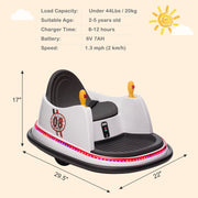 The LEADZM 6V 7A.h Electric Bumper Car in White is the ultimate ride-on toy for adventurous kids. With its colorful flashing lights, this bumper car will capture your child's imagination and provide endless hours of fun. This bumper car is equipped with a simple joystick or remote control that allows it to spin a full 360 degrees. Whether your child wants to take the wheel themselves or you want to safely guide them using the remote control, this bumper car offers both options. Safety is a top priority with the LEADZM 6V 7A.h Electric Bumper Car. It features a safe soft start system that ensures a smooth and secure ride. The adjustable seat belt provides additional safety and comfort for your child. The included rechargeable 6V battery allows for 1-2 hours of riding fun. Charging the battery takes approximately 8 hours, with the first charge requiring 18 hours. This bumper car is recommended for children aged 2 to 5 years old and has a maximum user weight of 44 lbs (20kg). Its compact dimensions of 29.5” x 22” x 17” (L x W x H) make it perfect for indoor or outdoor play. Package includes the rc ride on bumper car, an instruction manual, and a remote control. Let your child's imagination run wild with the LEADZM 6V 7A.h Electric Bumper Car in White. Get ready for endless hours of spinning and zooming fun! Specifications:- Color: White- Material: PP, Steel- Speed: 1.3 MPH (2km/h)- Maximum User Weight: 44 Lbs (20kg)- Recommended for Children 2 to 5 Years Old- Charging Time: 8-12 H (18 for first time)- Use Time: 1-2hrs- Battery Type: 6V 7AH- Product Dimension: 29.5” x 22” x 17” (L x W x H)Package includes:- 1 x Ride-on Bumper Car- 1 x Instruction Manual- 1 x Remote ControlBrand: LEADZM