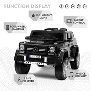 The Mercedes-Benz Electric Ride-On Car for Kids with Lights, Music, and Remote Control - 12V is the ultimate toy car for your child's adventurous spirit. This officially licensed Mercedes-Benz G650S ride-on car is designed to provide your child with mobility, fitness, coordination, and balance from an early age. Safety is a top priority with the JOYLDIAS 12V kids remote control ride on car, featuring overcharge and overload protection for a worry-free playtime. Key Features: Officially Licensed Mercedes-Benz G650S Two Modes of Operation: Kids can operate the car themselves through pedals and steering wheel, or parents can control the car through the 2.4GHz remote control Multiple and Joyful Functions: Built-in AUX port, USB, TF slot, music, Bluetooth, and story, horn for an enjoyable driving journey High-Bright LED Lights: Super cool driving experience, especially at night Safety and Comfort: Slow start function reduces the impact of sudden acceleration, door with safety lock, PU leather seat with safety belt Durable and Portable Design: Made of non-toxic PP and iron, wheels with spring suspension system suitable for all kinds of roads, luggage handle for easy outdoor transportation The JOYLDIAS Mercedes-Benz kids car is powered by a 12V 7AH large-capacity battery with overcharge and overload protection, ensuring a long-lasting and safe playtime. With 2 powerful motors, this ride-on car provides a thrilling speed of 2-4.5 KM/h. The car's dimensions are 46" (L) x 28" (W) x 23" (H) with a weight capacity of 66 lbs. Recommended for children over 37 months of age. Product Specifications: Color: Black Battery: 12V7AH*1 Charger: 12V900MA Car Speed: 2KM/H-4.5KM/H Maximum Load: 66 LBS Product Size: 46" x 28" x 23" Seat Size: 14.5" x 7.4" Back Cushion Size: 14.5'' x 9.8'' Applicable Age: 3+ years old (More suitable for children under 55 inches in height) Assembly Required: Yes Run Time: 45 minutes Charging Time: 8-12 hours (automatically controlled) Music Function: AUX/USB/TF Cards (USB Flash Drive/Mobile Phone etc.) Motor: 12V 30W540*2 The package includes 1 x Electronic Toy Car, 1 x Hardware Bag, 1 x Manual Instruction, and 1 x Bluetooth Remote Control. Please note that adult supervision is required when charging the battery and when children are riding the car. Ensure a safe driving environment by avoiding riding the car at night, near swimming pools, steep slopes, or public roads. The car should only be washed with a clean damp cloth and protected from weather conditions when not in use. Keep children away from the moving vehicle and do not let them touch the wheel for their safety. With its sleek design, exciting features, and safety measures, the Mercedes-Benz Electric Ride-On Car for Kids with Lights, Music, and Remote Control - 12V makes for a perfect gift for your child's birthday or Christmas. Let your child's imagination soar as they embark on thrilling ride-on adventures with this amazing toy car.