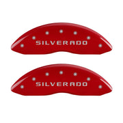 MGP Front set 2 Caliper Covers Engraved Front Silverado Red finish silver ch