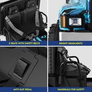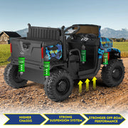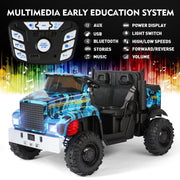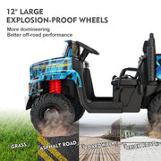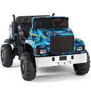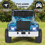 The Powerful 24V 2-Seater Kids Ride On Dump Truck Tractor with Camo Design and 3 Speed Options, Includes Remote Control Prepare for an adventure like no other with the Powerful 24V 2-Seater Kids Ride On Dump Truck Tractor with Camo Design and 3 Speed Options. This ride-on truck is perfect for kids aged 3 and above, providing them with a thrilling and safe driving experience. With its unique camo blue color, this ride-on truck is sure to stand out from the crowd. Key Features: TWO-SEATER RIDE ON TRUCK W/TRAILER - With an 18.5'' seat and 2 separate safety belts, this ride-on tractor is suitable for 2 kids under the age of 4 or a child aged 7 or 8. Let your little ones enjoy double the fun with one purchase. The tiltable trailer and lockable tailgate provide extra storage space for toys and snacks, enhancing the overall riding experience. TWO MODES TO OPERATE - Kids can take control of the electric truck themselves using the pedals and steering wheel, allowing them to enjoy the thrill of driving at 2 different speeds. Parents can also take charge using the 2.4GHz remote control, which offers 3 speed options for added safety and control. MULTIPLE AND JOYFUL FUNCTIONS - Equipped with a built-in AUX port, USB, TF slot, and Bluetooth, this ride-on truck offers endless entertainment options for your child's driving journey. They can listen to their favorite tunes while cruising around. The high-bright headlights add a cool factor, making nighttime adventures even more exciting. DURABLE AND SAFE DESIGN - Crafted from non-toxic PP and iron materials, this electric vehicle for kids is built to last. The wheels feature a spring suspension system, ensuring a smooth and comfortable ride on various terrains, including asphalt, brick, and cement roads. PERFECT GIFT - Powered by 2 large-capacity 12V7AH batteries with overcharge and overload protection, this ride-on truck is equipped with 2 powerful motors. With a large size of 47''x31''x27'' and a speed range of 4.5-5.5 km/h, it's the perfect present for your child's birthday or Christmas. Product Specifications: Color: Camo Blue Battery: 24V (12V7AH*2) Charger Input: 100-240V Output: 28.8V 500mA Motor: 200W*2 Charge/Use Time: Charge for 14 hours, use for 45-60 minutes Loading Capacity: 88 lbs Speed: 4.5-5.5 km/h Size: 47''x31''x27'' Height Limit: 43.3'' Package Content: 1 x Electronic Ride On Car 1 x Hardware Bag 1 x Manual Instruction 1 x Remote Control