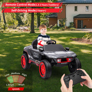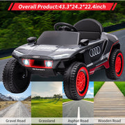 The Premium 12V Ride-On Car for Kids with Remote Control, LED Lights, and Long-Lasting 7Ah Battery - Suitable for Ages 3 and Up is the perfect toy car for your little adventurer. Modeled after the Audi limited edition racing car, this ride-on car combines rugged design with a scaled-down size, satisfying children's love for cars and their sense of innovation.Installation is a breeze with this rc ride on car. The AUDI LOGO on the whole body showcases the level of quality and detail in this children's car. Built-in media and horn add an extra element of fun for children, allowing them to immerse themselves in imaginative play.This ride-on car offers two driving modes to suit your child's needs. They can drive the vehicle themselves by stepping on the pedal, giving them a sense of independence and control. Alternatively, parents can take control of the car's speed and emergency braking through the remote control, ensuring their child's safety and avoiding any potential dangers.The 4 spring suspension and EVA tires of this ride-on car provide excellent anti-slip and shock absorption effects. This means that your child can enjoy their ride-on car on various terrains such as sand, grass, gentle slopes, and small obstacles. The EVA wheels are wear-resistant and provide stability, ensuring a smooth and enjoyable ride for your little one.With an overall size of 43.3" x 24.2" x 22.4" and a maximum load capacity of 80lbs, this ride-on car is suitable for children aged 3 and up. It is powered by a 12V 7Ah battery and features 2*35W motors, providing a runtime of 1-2 hours. The speed of the car can be adjusted between 1.8-4mph, allowing your child to have a thrilling and safe ride.Specifications:- Product Dimensions: 43.34 x 24.23 x 22.46 inches- Country of Origin: China- Item Weight: 50 pounds- Manufacturer recommended age: 36 months - 8 yearsGet ready to ignite your child's imagination and let them embark on exciting adventures with the Premium 12V Ride-On Car for Kids with Remote Control, LED Lights, and Long-Lasting 7Ah Battery. Order yours today and watch your child's face light up with joy as they experience the thrill of their very own ride-on car.