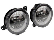 Axial's LED Headlights with multi-color halos are an excellent way to upgrade the visibility and appearance of your Jeep. These Axial Headlights feature high output white LED lighting that will certainly be much brighter than your factory incandescent headlights. These Headlights also feature great looking integrated multi-color accent halos that will add unique custom lighting effects to your Jeep's exterior. Lighting options include a full array of colors, as well as strobe, pulsating and a solid modes. The free App will allow you to adjust colors/modes giving you complete control via your smartphone. Manufactured to perform in the harshest conditions, these Axial Headlights feature rugged aluminum housings with crystal clear polycarbonate lenses. Featuring 5W high intensity white OSRAM LEDs, these Axial Headlights have a 6500K color temperature with a lifespan of 50,000 hours making them ideal for off-road use. Each Headlight is epoxy sealed, with an ip67 rating, to prevent moisture from harming the state of the art electronics found inside. Axial designed their LED Headlights to be a direct plug and play replacement for your Jeep's original factory headlights. With the included wiring harness adapters, installation can be completed in under 1 hour. It should be noted that the halo accent of the Light will require splicing into your Jeeps side marker/running lights for operation. These 9-Inch LED Headlights with RGB Halo