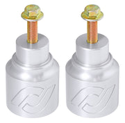 RockJock Front Upper Bump Stops for JL Wrangler and JT Gladiator EcoDiesel engine models are a completely different take on bump stops! In high articulation situations, tradtional axle housing mounted bump stops end up rotating inward toward the center of the vehicle, often missing the upper bump stop entirely, see diagram in the photo gallery). By lowering the upper bump stop, you are able to guarantee bump stop contact with the bump stop pad on the axle. The vehicles factory yellow jounce bumpers are retained and relocated by reinserting them back into the bottom of the new aluminum RockJock bump stop bodies. This provides factory feel when the bump stops make contact. Finish is clear anodize on the aluminum and zinc plating on the spacers and bolts.