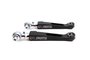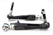 SPL Parts Front Lower Control Arms (FLCA) provide roll center, camber, and track width adjustment for the 2020+ Toyota Supra, and allow for full articulation with the proper ball joint angle. The main arm is slotted to allow the use of pinch bolts, and our rotating clamps on SPL Parts' exclusive Double Adjuster lock down camber and track width settings. No more jam nuts!! Long gone are the days of fumbling with multiple wrenches to tighten jam nuts in place while trying to keep your bearings oriented correctly. Our Double Adjuster is machined from 4130 Chromoly, gun drilled to reduce weight, then electroless nickel plated for corrosion resistance. Blue Anodized Titanium hardware shaves even more unsprung weight from the arms without compromising strength. Stainless Steel spacers are provided to correct roll center for lowered vehicles. The use of FK Rod Ends and High Misalignment Spherical Bearings eliminates the flex and binding found in the OEM control arms, while allowing smooth articulation.Sold as a pair.Made in the USA!SPL Parts Billet Lower Control/Trailing Arms Feature:• Lightweight 6061-T6 Billet Aluminum and Titanium Hardware• Electroless nickel plated 4130 Chromoly Double Adjuster for quick adjustment• Correct ball joint angle for full articulation• Rotating Clamp design allows for easy access to lock down alignment settings• Low friction 3 piece Teflon lined FK sphericals and Heim joints/rod ends• Multiple size Stainless Steel roll center spacers for precise adjustment