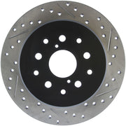 StopTech Drilled and Slotted Sport Rotors are 1-piece direct replacement brake discs for factory brake systems and stock calipers that look great behind your wheels – and offer significantly improved braking performance. The unique cross-drilling and slotting aids with heat and brake dust dispersal; prevents glazing of the pads; adds bite and improves wet and dry braking performance. Built to last; the black e-coating provides protection from corrosion and the high carbon metallurgy (in most applications) offers quieter operation; better crack resistance and increased performance.
