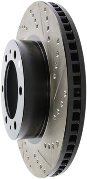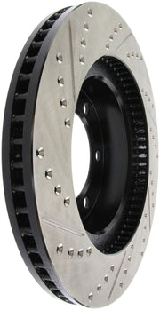 StopTech Drilled and Slotted Sport Rotors are 1-piece direct replacement brake discs for factory brake systems and stock calipers that look great behind your wheels – and offer significantly improved braking performance. The unique cross-drilling and slotting aids with heat and brake dust dispersal; prevents glazing of the pads; adds bite and improves wet and dry braking performance. Built to last; the black e-coating provides protection from corrosion and the high carbon metallurgy (in most applications) offers quieter operation; better crack resistance and increased performance.