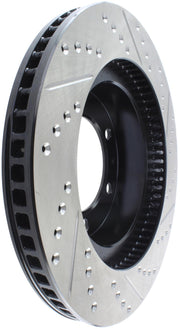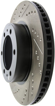 StopTech Drilled and Slotted Sport Rotors are 1-piece direct replacement brake discs for factory brake systems and stock calipers that look great behind your wheels – and offer significantly improved braking performance. The unique cross-drilling and slotting aids with heat and brake dust dispersal; prevents glazing of the pads; adds bite and improves wet and dry braking performance. Built to last; the black e-coating provides protection from corrosion and the high carbon metallurgy (in most applications) offers quieter operation; better crack resistance and increased performance.