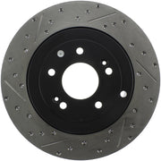 StopTech Drilled and Slotted Sport Rotors are 1-piece direct replacement brake discs for factory brake systems and stock calipers that look great behind your wheels – and offer significantly improved braking performance. The unique cross-drilling and slotting aids with heat and brake dust dispersal; prevents glazing of the pads; adds bite and improves wet and dry braking performance. Built to last; the black e-coating provides protection from corrosion and the high carbon metallurgy (in most applications) offers quieter operation; better crack resistance and increased performance.
