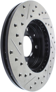 StopTech Drilled and Slotted Sport Rotors are 1-piece direct replacement brake discs for factory brake systems and stock calipers that look great behind your wheels – and offer significantly improved braking performance. The unique cross-drilling and slotting aids with heat and brake dust dispersal; prevents glazing of the pads; adds bite and improves wet and dry braking performance. Built to last; the black e-coating provides protection from corrosion and the high carbon metallurgy (in most applications) offers quieter operation; better crack resistance and increased performance.