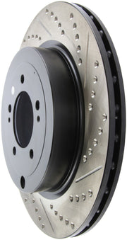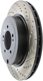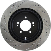StopTech Drilled and Slotted Sport Rotors are 1-piece direct replacement brake discs for factory brake systems and stock calipers that look great behind your wheels – and offer significantly improved braking performance. The unique cross-drilling and slotting aids with heat and brake dust dispersal; prevents glazing of the pads; adds bite and improves wet and dry braking performance. Built to last; the black e-coating provides protection from corrosion and the high carbon metallurgy (in most applications) offers quieter operation; better crack resistance and increased performance.