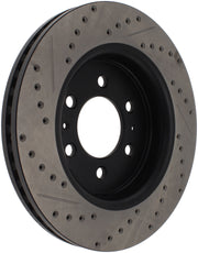 StopTech Drilled and Slotted Sport Rotors are 1-piece direct replacement brake discs for factory brake systems and stock calipers that look great behind your wheels – and offer significantly improved braking performance. The unique cross-drilling and slotting aids with heat and brake dust dispersal; prevents glazing of the pads; adds bite and improves wet and dry braking performance. Built to last; the black e-coating provides protection from corrosion and the high carbon metallurgy (in most applications) offers quieter operation; better crack resistance and increased performance.