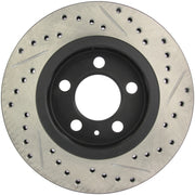 StopTech Drilled and Slotted Sport Rotors are 1-piece direct replacement brake discs for factory brake systems and stock calipers that look great behind your wheels – and offer significantly improved braking performance. The unique cross-drilling and slotting aids with heat and brake dust dispersal; prevents glazing of the pads; adds bite and improves wet and dry braking performance. Built to last; the black e-coating provides protection from corrosion and the high carbon metallurgy (in most applications) offers quieter operation; better crack resistance and increased performance.