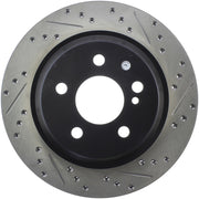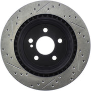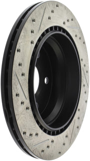 StopTech Drilled and Slotted Sport Rotors are 1-piece direct replacement brake discs for factory brake systems and stock calipers that look great behind your wheels – and offer significantly improved braking performance. The unique cross-drilling and slotting aids with heat and brake dust dispersal; prevents glazing of the pads; adds bite and improves wet and dry braking performance. Built to last; the black e-coating provides protection from corrosion and the high carbon metallurgy (in most applications) offers quieter operation; better crack resistance and increased performance.