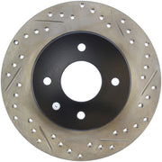 StopTech Drilled and Slotted Sport Rotors are 1-piece direct replacement brake discs for factory brake systems and stock calipers that look great behind your wheels – and offer significantly improved braking performance. The unique cross-drilling and slotting aids with heat and brake dust dispersal; prevents glazing of the pads; adds bite and improves wet and dry braking performance. Built to last; the black e-coating provides protection from corrosion and the high carbon metallurgy (in most applications) offers quieter operation; better crack resistance and increased performance.