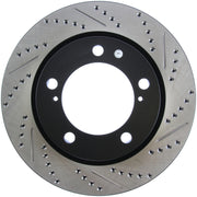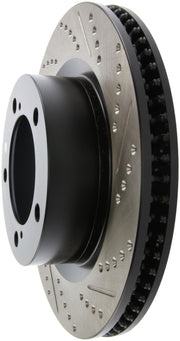 StopTech Drilled and Slotted Sport Rotors are 1-piece direct replacement brake discs for factory brake systems and stock calipers that look great behind your wheels – and offer significantly improved braking performance. The unique cross-drilling and slotting aids with heat and brake dust dispersal; prevents glazing of the pads; adds bite and improves wet and dry braking performance. Built to last; the black e-coating provides protection from corrosion and the high carbon metallurgy (in most applications) offers quieter operation; better crack resistance and increased performance.
