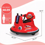 The TOBBI 12V Electric Bumper Snail Car for Toddlers with Remote Control is a rc ride on toy that will create precious childhood memories for your little ones. This eye-catching bumper car features a snail-shaped appearance and comes in different vibrant colors. Made with high-grade material and equipped with rubber anti-collision strips, this bumper car is designed for reliability and safety. The seat belt ensures that your children are secure while enjoying their ride.With two motors, this bumper car allows for long-distance driving, giving your kids endless fun. It is suitable for children aged from 37 to 96 months, making it perfect for toddlers and young kids. The two universal wheels enable easy 360-degree rotation, allowing your kids to spin around with excitement. The bumper car also features vibrant lights that offer a realistic driving experience, further enhancing the fun.Safety is a top priority with this bumper car. The rubber strips increase its crashworthiness, providing added protection during playtime. The stunning appearance of the car distracts kids from electronic devices, encouraging them to engage in active play. The appealing stickers on the car catch their attention and spark their interest, making it even more enjoyable for them.Made with premium PP material, this bumper car is built to last, enabling kids to use it for an extended period of time. For kids who are unable to operate the car themselves, the remote control feature brings an extra level of fun. The cut-off protector with a fuse ensures that kids are protected from electricity hazards while charging the car.This TOBBI Electric Bumper Snail Car is certified by CPSIA, CPC, and ASTM-F963, meeting the highest safety standards for children's toys. It is available in a striking Red+Black color combination, adding to its visual appeal. With a weight capacity of 66.14 lbs, this bumper car is suitable for children aged 3 to 9 years.The overall dimensions of the car are 26.77"L x 26.77"W x 18.11"H, providing a comfortable and spacious ride for your little ones. The net weight of the car is 11.9 lbs, making it easy to maneuver. The maximum speed of the car is 1.86 mph, ensuring a safe and enjoyable ride for your kids.Included in the package are the Electric Bumper Car, a user manual, a remote control, and a charger. Get ready to create unforgettable childhood memories with the TOBBI 12V Electric Bumper Snail Car for Toddlers with Remote Control. Let your kids experience the joy of driving their own bumper car while ensuring their safety and providing endless fun.Specifications:- Brand: TOBBI- Color: Red+Black- Material: PP- Net Weight: 11.9 lbs- Weight Capacity: 66.14 lbs- Suitable Age: 37 to 96 Months- Overall Dimensions: 26.77"L x 26.77"W x 18.11"H- Motor: 12V(18W)x2- Battery: 6V 4.5AHx2- Charger: 120V AC 60HZ (Input); 12V DC 700MA (Output)- Maximum Speed: 1.86 mphPackage Includes:- 1 x Electric Bumper Car- 1 x User Manual- 1 x Remote Control- 1 x Charger