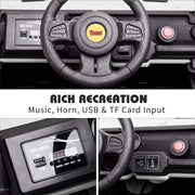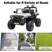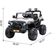 The TOBBI 12V Electric Remote Control Kids Ride-On Truck in White is the perfect toy for creating exciting adventures for the little ones in your life. This electric ride-on truck features front and rear lights, realistic engine sounds, double doors, and so many functions that will keep your child entertained for hours. This advanced kids' rc ride on car comes with a distinctive grille, roll bars, two open doors with locks, front and back fenders, a rear luggage box, and realistic bodywork details, making it look just like a real SUV. The LED lights, shock absorption, battery indication, soft starting, and speed adjustment add to the rich vehicle recreation experience. Parents can also remotely control the toy vehicle with the included 2.4G remote control, allowing them to change between 3 different speeds and ensure their child's safety. The 12-volt battery provides speeds that are slow enough for one child to ride safely. The TOBBI ride-on truck is equipped with an MP3 player, USB port, TF card slot, volume adjustment, and realistic engine sound, adding to the fun and excitement. The adjustable seat belt ensures safe and comfortable use, while the large space allows your child to sit and play comfortably. This ride-on truck is made from durable reinforced plastic, making it sturdy enough for both outdoor and indoor use. It can withstand up to 66.14 pounds of weight, making it suitable for children aged 3 to 8 years old. Assembly is easy with the included detailed instruction manual, ensuring safe operation while having fun and creating indelible memories.Specifications:- Brand: TOBBI- Theme: Cars- Recommended Age Range: 3-6 years- EAN: 6973504021489- Battery: 12 volts/4.5 amp-hours- Loading capacity: 66.14 pounds- Material: Propylene plastic- Color: White- Dimensions (L x W x H): 43.31 x 28.35 x 28.35 inches- Weight: 33.07 poundsLet your children explore the world around them with the exciting play of the TOBBI 12V Electric Remote Control Kids Ride-On Truck in White.