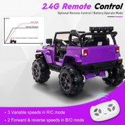 TOBBI 12V Kids Electric Truck with Remote Control, Music, and Horn - Fun Ride-On Car for Children Introducing the TOBBI 12V Kids Electric Truck with Remote Control, Music, and Horn. This battery-powered ride-on truck features a stylish Wrangler look with bright LED lights, accessible magnet doors, and an integrated MP3 player. It's the perfect car toy for your little driver to hit the streets in style. Key Features: Moving forward and backward with in-car control by the pedal and steering wheel Ergonomic seat with a safety harness 4 shock-absorbing large wheels for a smooth and safe ride 12V UL-certificated rechargeable battery for a long-lasting cruise Constructed with toughened kid-friendly plastic for durability Integrated MP3 player with adjustable volume Kids manual operation and parent remote control for maximum safety Dual motor vehicle built with 4 spring-suspension knobby wheels USB port and TF slot allow you to connect your own device Maximum speed of 3.7mph for smooth driving around the house Product Specifications: Color: Purple Material: PP + Iron Net Weight: 45.2 lbs Overall Dimension: 46.45"L x 31.1"W x 28.89"H Maximum Weight Capacity: 66 lbs Recommended Age Range: 3-6 years old Motor: Twin 12V Battery: 12V 7AH Charger: 12V 1000MA Charging Time: 8-12 hours Speed: 1.86-3.73 mph Suitable Battery for RC: AAA 1.5V x 2 (not included) Get ready for an outdoor adventure with the TOBBI 12V Kids Electric Truck. This rc ride on car is the perfect gift for toddlers aged 3-6 years old. With its stylish design and exciting features, your little one will have a blast driving around in their very own truck. The 12V UL-certificated rechargeable battery ensures a long-lasting cruise, while the toughened kid-friendly plastic construction makes it durable for long-term use. Let your child enjoy their favorite music and stories with the integrated MP3 player, and rest assured knowing that you can also control the truck with the parent remote control for maximum safety. The dual motor vehicle is built with 4 spring-suspension knobby wheels, providing a smooth and comfortable ride. Plus, the USB port and TF slot allow you to connect your own device for even more entertainment options. With a maximum speed of 3.7mph, your child can confidently drive around the house and explore their surroundings. So, let your little driver embark on a thrilling ride-on adventure with the TOBBI 12V Kids Electric Truck!