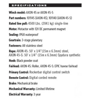 AXON 45-S includes 50’ of lightweight, easy-to-handle ¼” Spydura synthetic rope, an Epic hawse fairlead, and a black hook