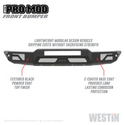 Westins Pro-Mod Front Bumper combines enhanced vehicle protection, with great looks. Pro-Mods revolutionary lightweight modular design is uniquely engineered with outrigger reinforcement brackets to provide maximum front end protection without compromising on strength, integrity or durability. The "high and tight" bumper profile creates a greater approach angle, which significantly improves off-road driving capabilities. The lightweight design also requires smaller shipping packages which dramatically reduces shipping costs. Pro-Mod bumpers feature a textured black finish with an e-coated base coat, providing long lasting corrosion protection from the elements. Once you see the Pro-Mod Front Bumper, the choice becomes obvious.