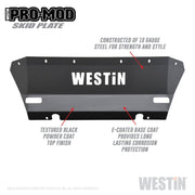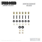 Westin's Pro-Mod Skid Plate is constructed of durable 10 gauge steel to protect your vehicle from damage caused by road debris. It mounts directly to the frame and includes a laser-cut Westin logo. Offers bolt-on installation so no drilling is required. Hardware and mounting brackets included.