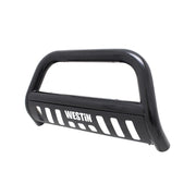 Westins E-Series Bull Bar is a front-end light bar designed for trucks and larger model SUVs. It mounts to the vehicles existing mounting points with no drilling required and comes complete with vehicle specific mount kit. It also features mounting points for 2 auxiliary lights up to 6 inches in diameter. The E-Series Bull Bar features a laser cut Westin block letter logo design on the skid plate. Available in black powder coated e-coated steel with a textured black skid plate backed by a 3 year warranty. Optional license plate bracket is available.