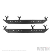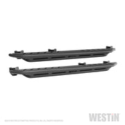 Westin Triple Tube Rock Rails are frame mounted Jeep Wrangler side steps that protect vehicle rocker panels. Made of three 16 gauge welded tube construction. Full-length step area features louvered styling and a texture coated finish for slip resistance and easy cleaning. A welded plate that features a laser cut Westin logo is welded between the 2 inch upper and lower tubes to provide added support. Available for 2 door and 4 door Jeep Wrangler in textured black finish.