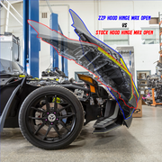 Want to replace your ugly stock hood hinges with a set of beautiful CNC'd billet aluminum replacements? Then this is the product for you. This kit allows you to open your Slingshot hood 18° further than stock. It features an adjustable stop to adjust where the hood opens to, meaning you can allow it to stop prior to the 18°. Our kit is superior to others on the market in the fact that we redesigned the top and bottom brackets to keep the angle geometry near enough to stock, that it doesn't require a hood assist shock to open the hood. It will open just like it did from the factory.